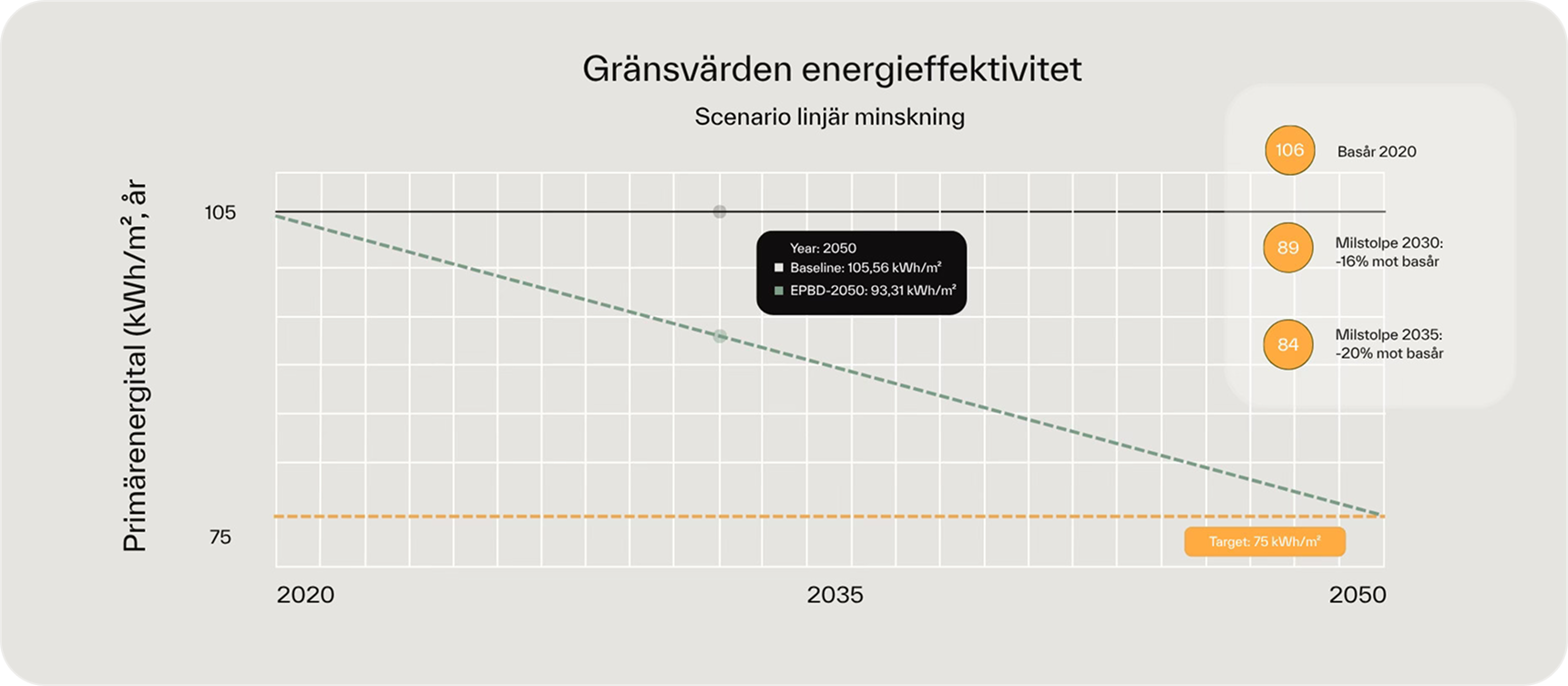 Boverket refererar till ett antal scenarion för att nå dit, bl.a. med accelererad och linjär utveckling mot målet, det som också kallas för den "svenska klausulen". Vilken väg ska väljas är inte fastställd än och i nuvarande version utgår Boverket från den accelererade utvecklingen som ligger inom intervallet som motsvarar energiklass D och nedan värden: