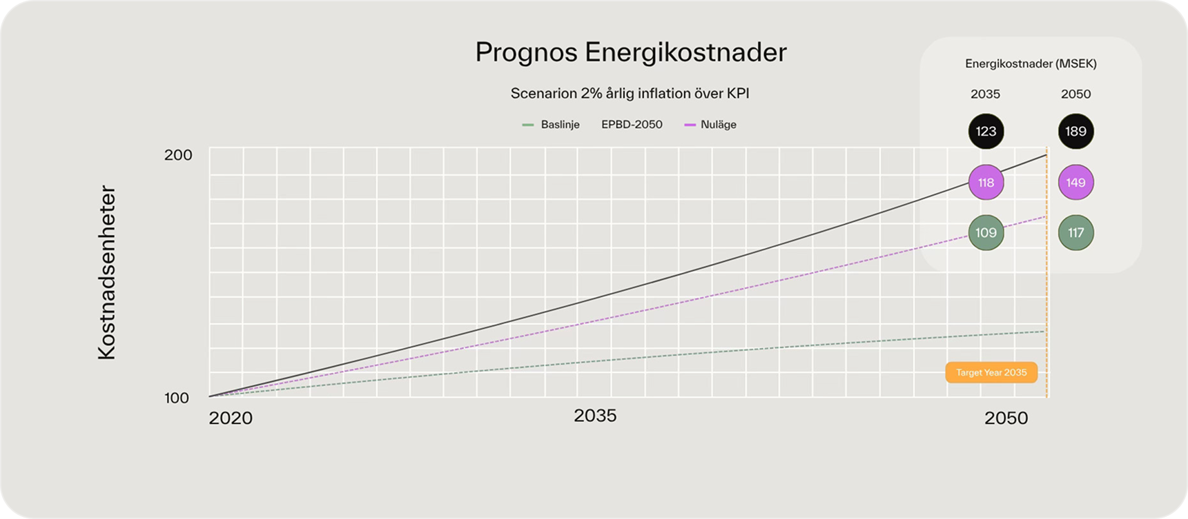 Det grundar sig på antaganden med 2% inflation över KPI. Konsekvensen av en ökad energieffektiviseringstakt blir högre driftnetto, starkare utveckling av fastighetsvärde och mer förmånliga finansieringsmöjligheter.